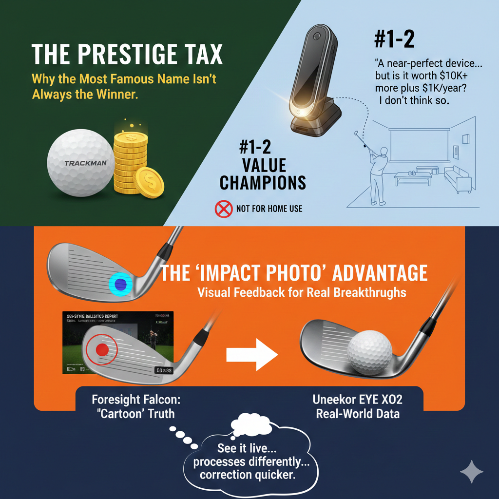 The critical distinction for the social golfer is the overhead form factor. Units like the Falcon and EYE XO2 stay put on the ceiling. This is the “holy grail” for hosting mixed-handed groups; you never have to move the hardware between shots. When you factor in the lack of annual subscription fees, these units eventually become more affordable than “cheaper” alternatives that bleed you for $1,000 every single year.